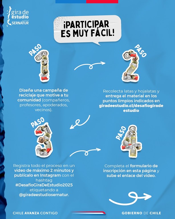 Para participar del Desafío Gira de Estudio, los interesados deben ingresar al sitio web www.giradeestudio.cl/desafiogiradeestudio, leer las bases del concurso y motivar a sus compañeros para crear la mejor campaña de reciclaje de latas y hojalatas hasta el 15 de diciembre de 2025.