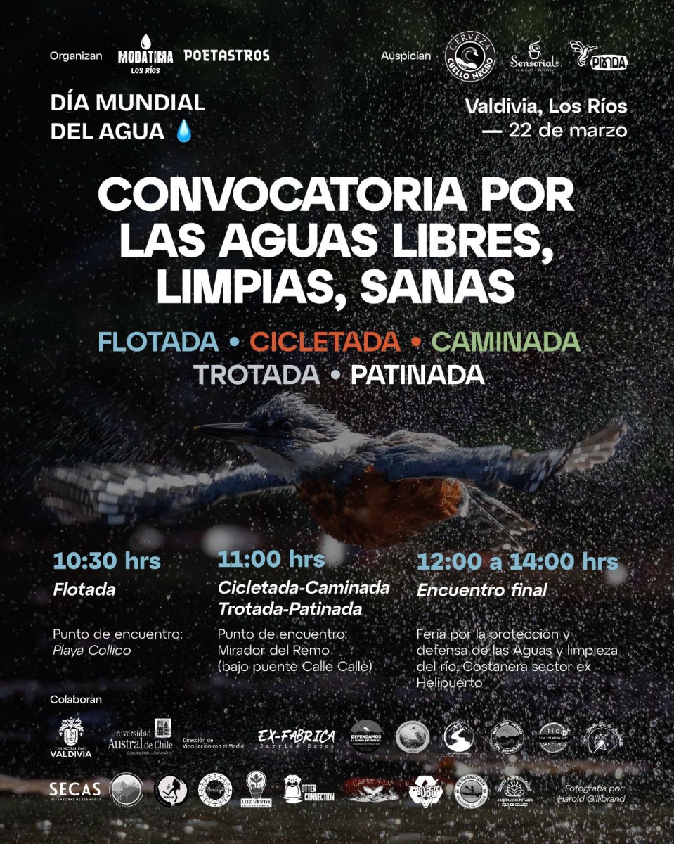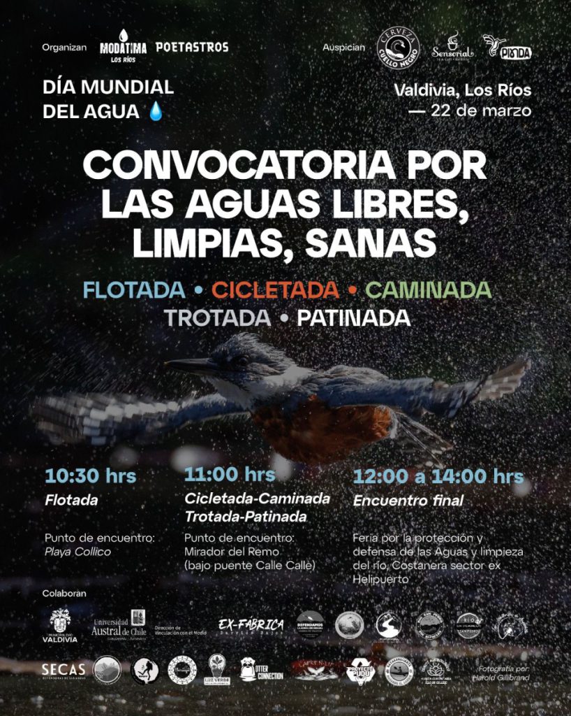 La jornada comenzará durante la mañana con una convocatoria ciudadana denominada “Convocatoria por las aguas libres, limpias y sanas”, que incluirá una flotada desde Playa Collico a las 10:30 horas, seguida por una cicletada, caminata, trotada y patinada, a partir de las 11:00 horas desde el Mirador del Remo, Puente Calle Calle. El cierre de esta movilización se realizará entre las 12:00 y 14:00 horas en la costanera del sector ex Helipuerto, donde se desarrollará una feria educativa medioambiental por la protección de las aguas, para culminar a las 18:00 horas en el Teatro Cervantes con un acto cultural . Esta articulación de actividades busca reforzar el vínculo entre territorio, participación y cuidado de los ecosistemas, en una región marcada por la presencia de cuencas y conflictos socioambientales asociados al agua.